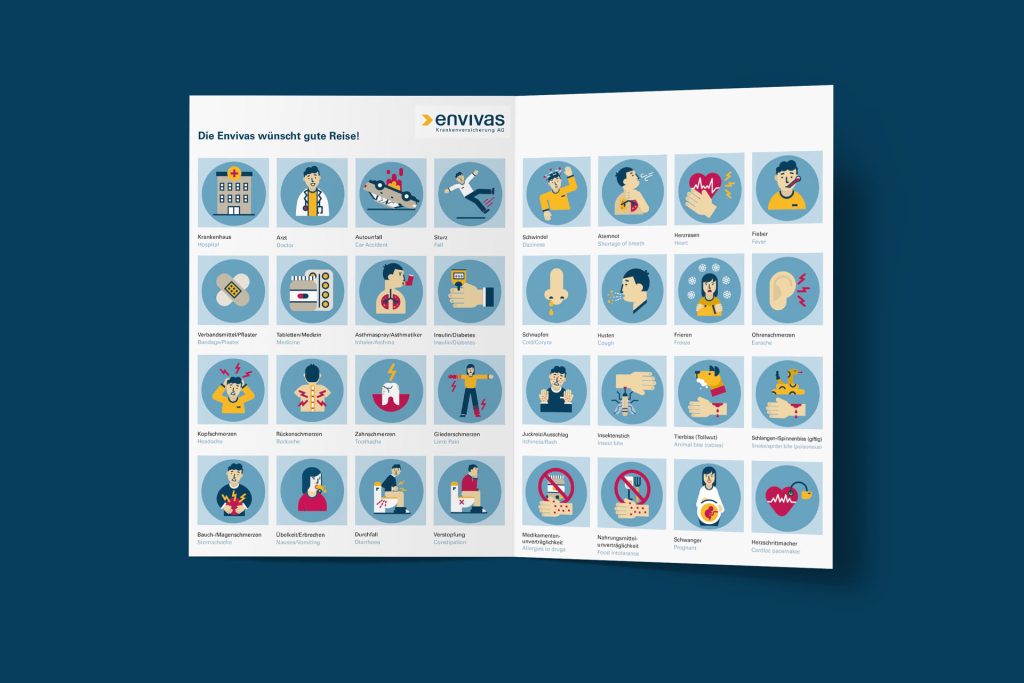 Was, wenn im Urlaub eine medizinische Notlage eintritt und man die Landessprache nicht spricht? Wie einem Arzt mitteilen, wo und welche Schmerzen man hat? Für soll einen Fall stellt die Envivas Krankenversicherung AG ihren Kunden ein Bilderwörterbuch als Download zur verfügung. Unsere Aufgabe war die Entwicklung und Illustration eines modularen Piktogramm-Systems nach CI-Vorgaben der Envivas Krankenversicherung. Insgesamt sind 24 Piktogramme entstanden die die Grundlage des Envivas Illustrationsstils bilden.