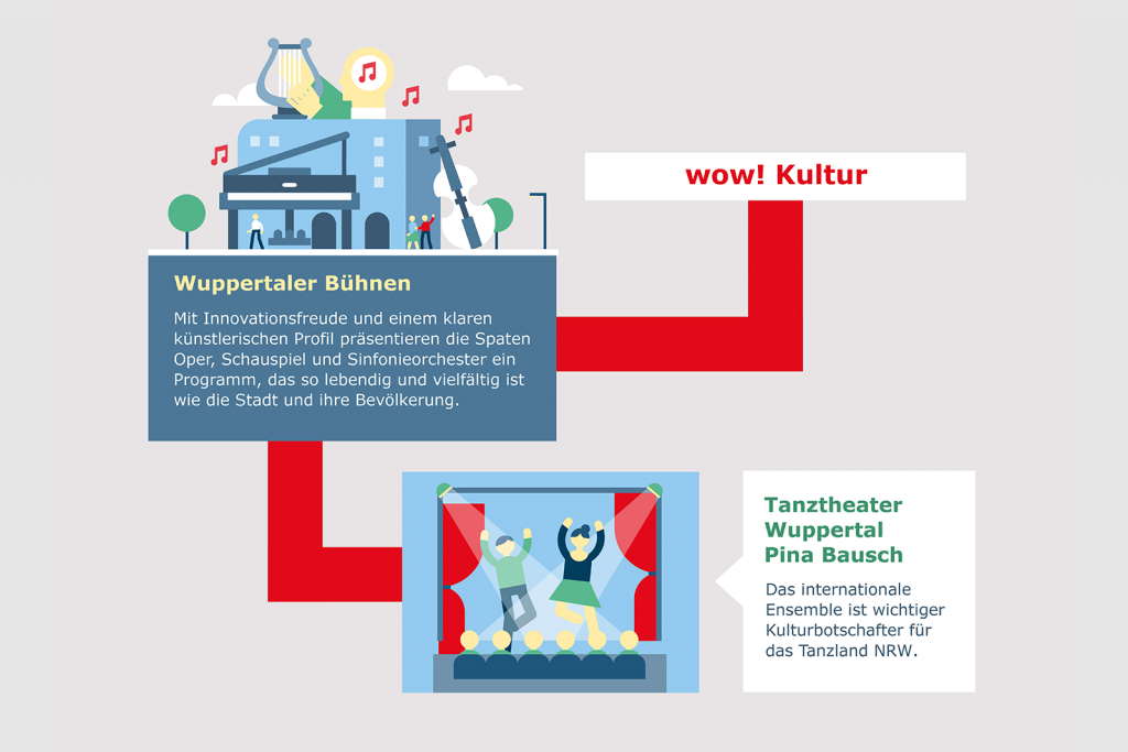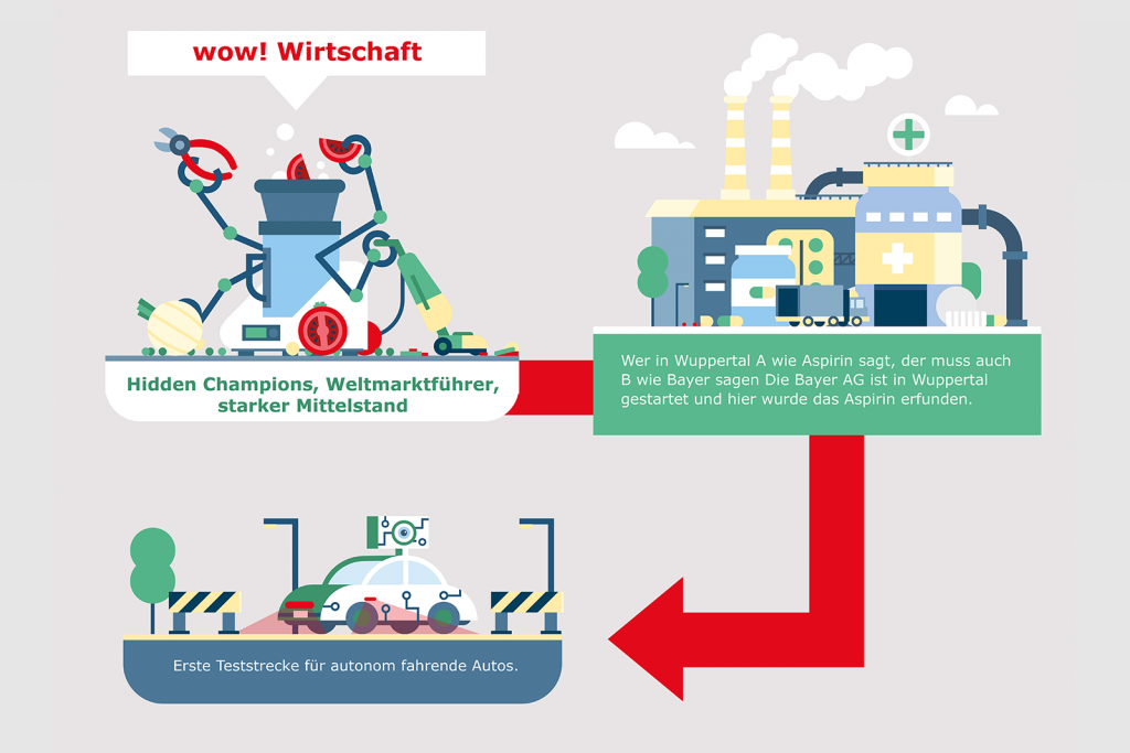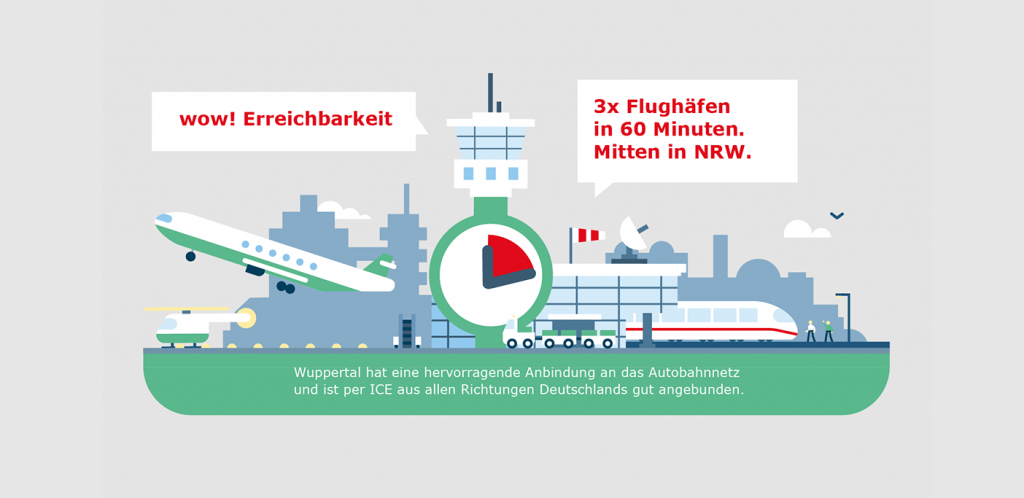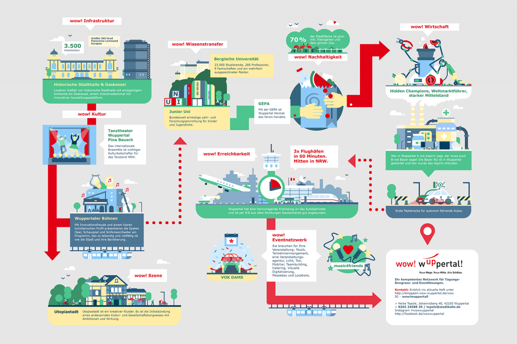 Schon mal was von Wow! Wuppertal! gehört. Nein?! Hinter diesem Namen verbirgt sich ein Netzwerk für Tagungs-, Kongress- und Eventlösungen aus Wuppertal. Um dieses neu gegründete Netzwerk in seiner Außenwahrnehmung zu unterstützen wurde wir beauftragt eine Infografik zu entwickeln. Das besondere an der Infografik ist das sie als modulares System konzipiert wurde. D.h. sie kann ohne Probleme um Illustrationen erweitert oder sogar mit Animation ergänzt werden.