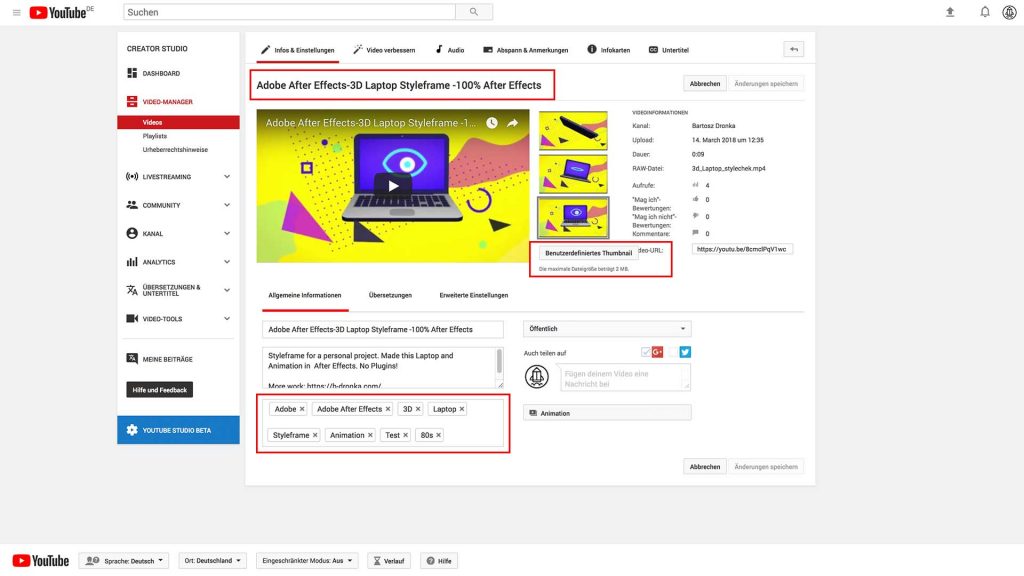 An der Qualität sollte man nicht sparen! Empfehlenswert ist mindestens Full HD (1920x1080px). YouTube prüft die Videooptionen während des Upload-Vorgangs und legt automatisch eine Videoauflösung für den Start fest.